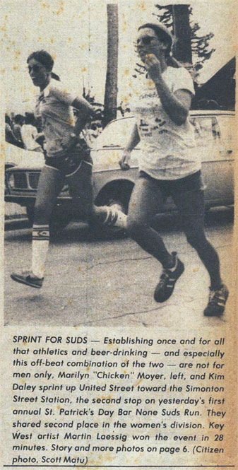 SPRINT FOR SUDS – Establishing once and for all that athletics and beer-drinking-and especially this off beat combination of the two – are not for men only, Marilyn “Chicken” Moyer, left, and Kim Daley sprint up United Street towards the Simonton Street Station, the second stop on yesterday’s first annual St. Patrick’s Day Bar None Suds Run. They shared second place in the women’s division. Key West artist Martin Laessig won the event in 28 minutes. Story and more photos on page 6. (Citizen photo, Scott Matu)